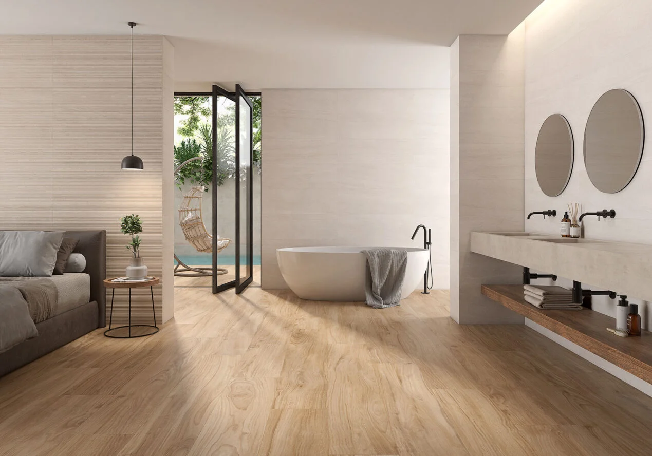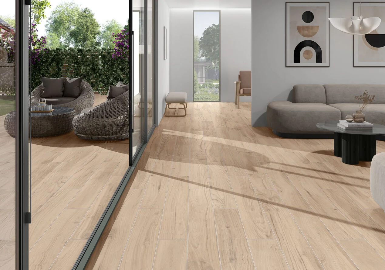Conçue pour s’adapter à tous les projets d’intérieur tels que sols résidentiels, commerciaux ou espaces publics, cette série offre un style sobre tout en gardant le côté chaleureux grâce à son imitation bois.