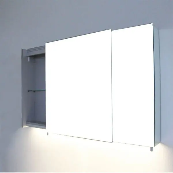 Contour miroir Porte coulissante en miroir Etagère en verre 6 mm réglable en hauteur Eclairage LED Norme IP44 60 LED/mètre 4200 °K Dimensions (L - H - P en mm) 1050 x 650 x 170