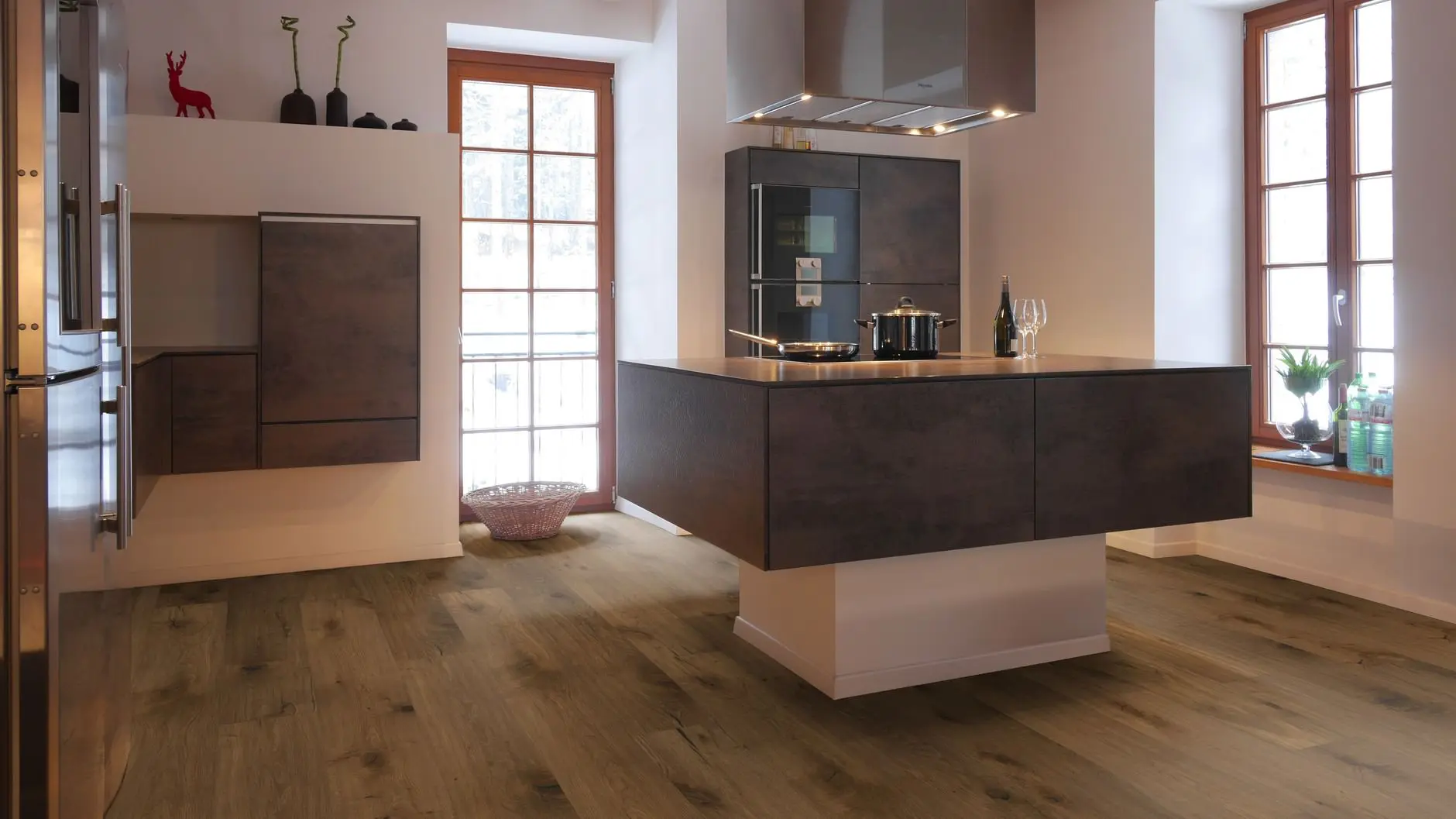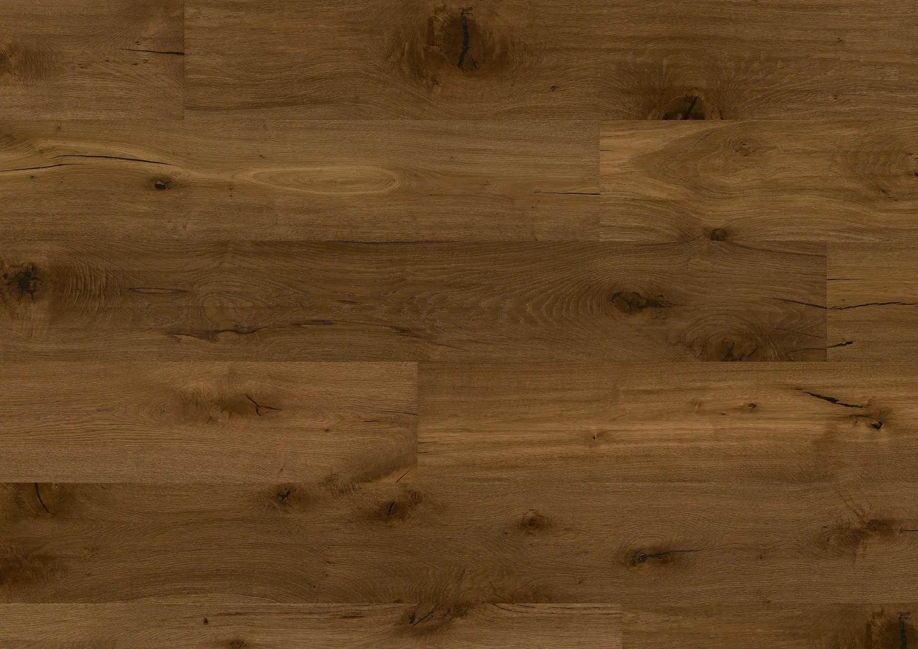 Contrecollé avec une couche d'usure de 0,4mm finition fumé, raboté à la main, brossé, huilé naturellement.